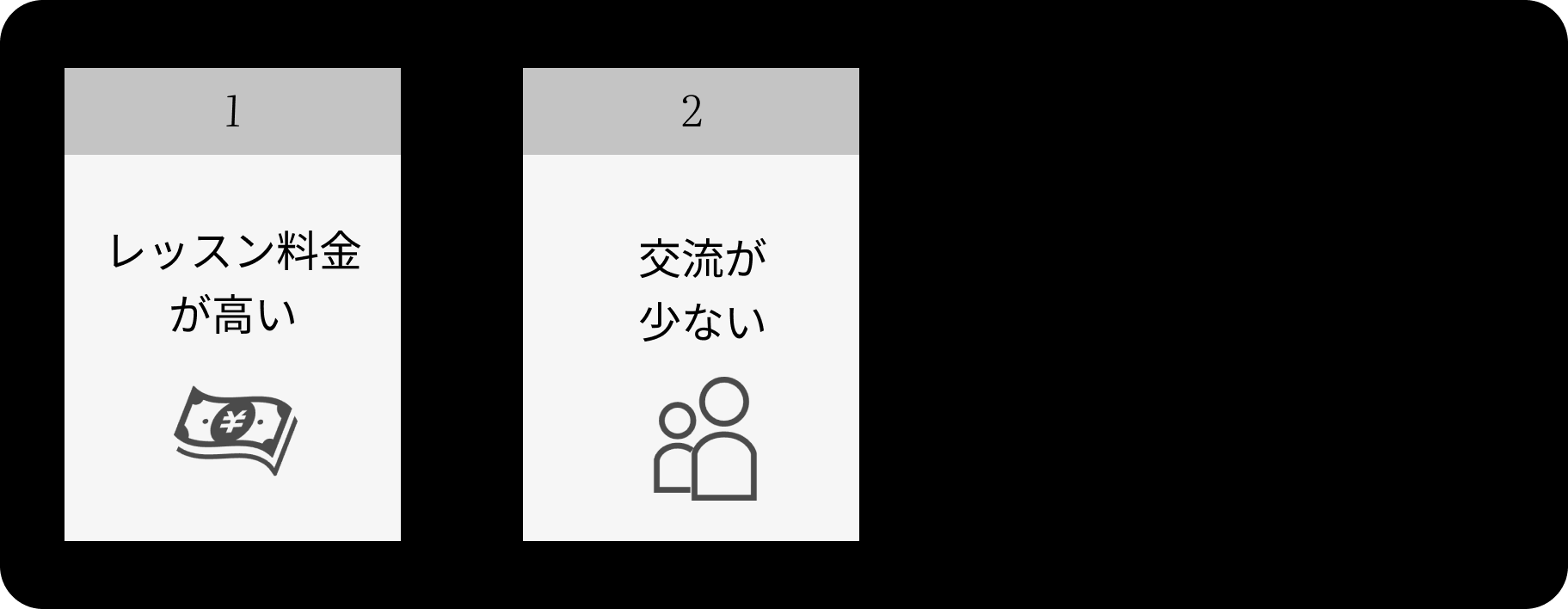 また、複数人同時レッスンのため個々のスキルレベルが違う人たちが集まっています。 そのため、「レベルについていけない」や逆に「レベルが低くて不満」などが生じやすく、更に指導時間がスキルレベルによっても変わってきてしまいます。