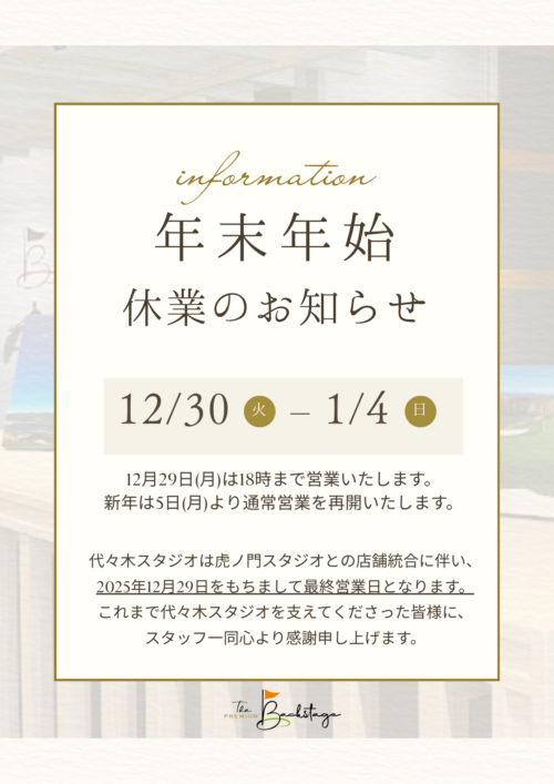 なお、代々木スタジオは虎ノ門スタジオとの店舗統合に伴い、2025年12月29日(月)をもちまして最終営業日となります。